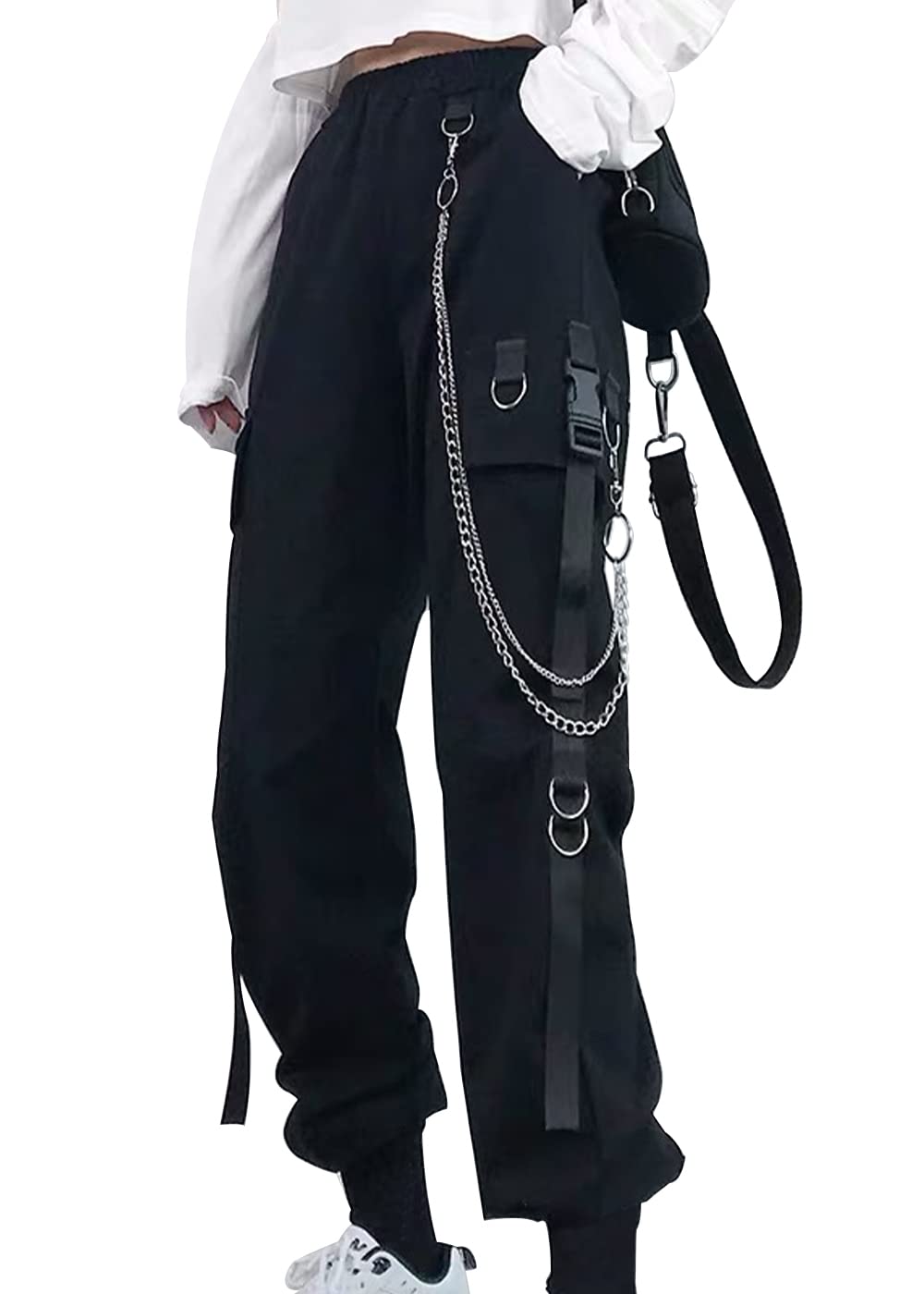 Women Black Trousers Pants with Chain Pocket High Waist Cap